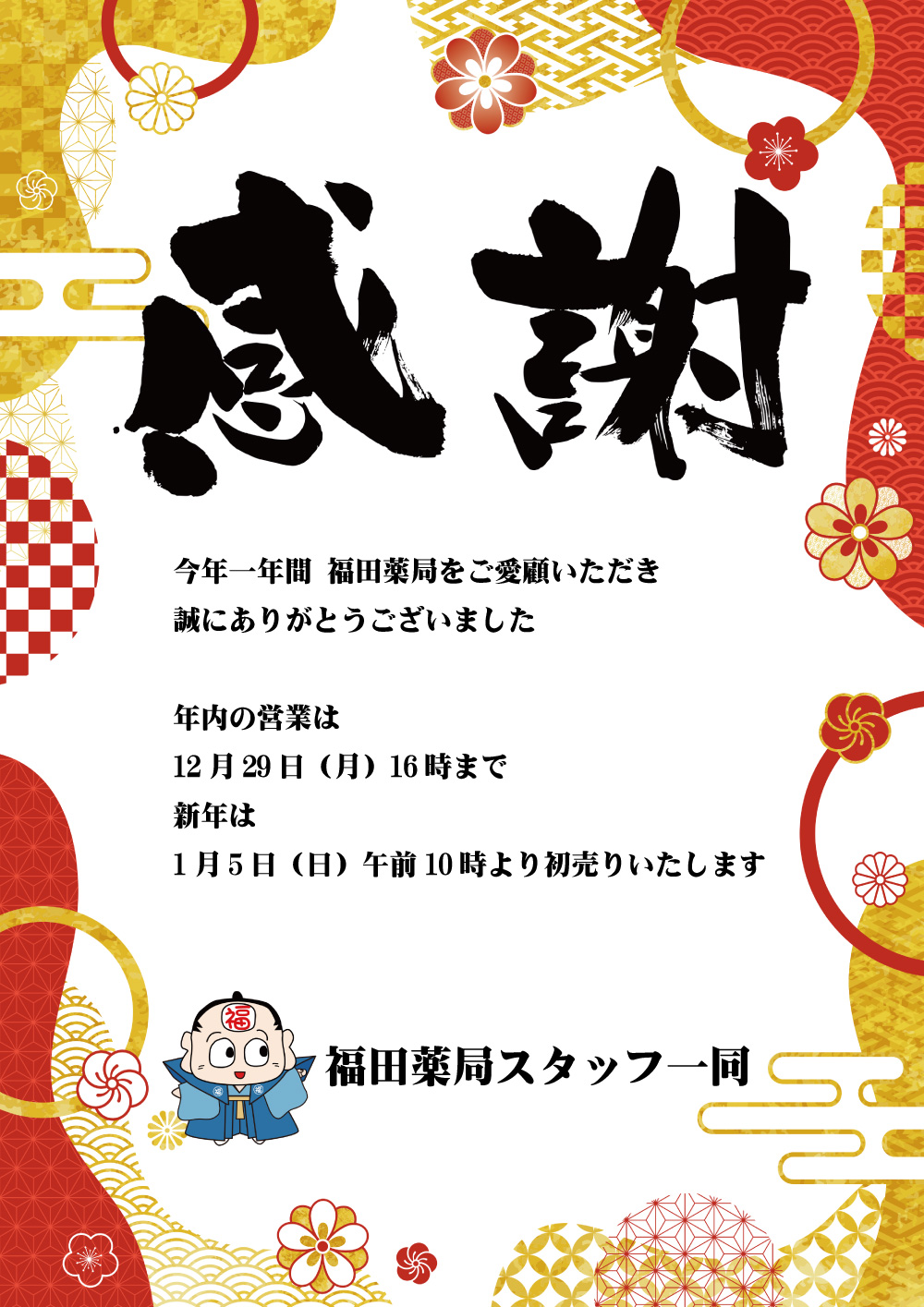 本日、年内最後の営業となりますm(__)m Posted on 2025年12月29日2025年12月28日 fukuyakuPosted in 店舗からのお知らせ 一年間、福田薬局をご愛顧いただき誠にありがとうございました。 年内の営業は12月29日(日)夕方まで とさせていただきます。 新年は1月5日(日)午前10時より初売り を開始いたします。 2026年も、地域の皆さまの健康を支える身近な薬局であり続けられるようスタッフ一同努めてまいります。 どうぞ良いお年をお迎えください。 福田薬局スタッフ一同