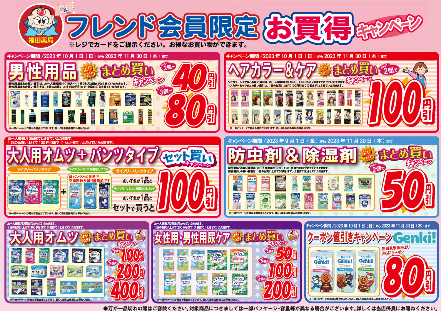10月のメーカータイアップ企画です! Posted on 2023年10月2日2023年10月2日 fukuyakuPosted in 店舗からのお知らせ フレンド会員限定企画!今月のメーカータイアップ企画も盛り沢山です。 レジでフレンド会員をご提示ください。お得なお買い物ができます。 ぜひ、福田薬局の店頭でお確かめください!