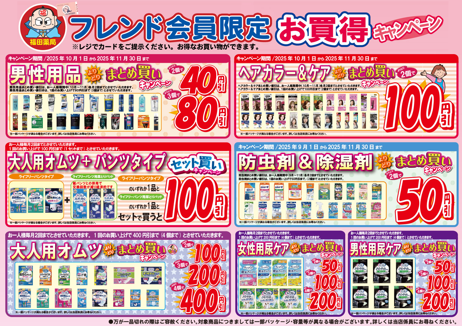 10月のメーカータイアップ企画です! Posted on 2025年10月1日 fukuyakuPosted in 店舗からのお知らせ フレンド会員限定企画!今月のメーカータイアップ企画も盛り沢山です。 レジでフレンド会員をご提示ください。お得なお買い物ができます。 ぜひ、福田薬局の店頭でお確かめください!