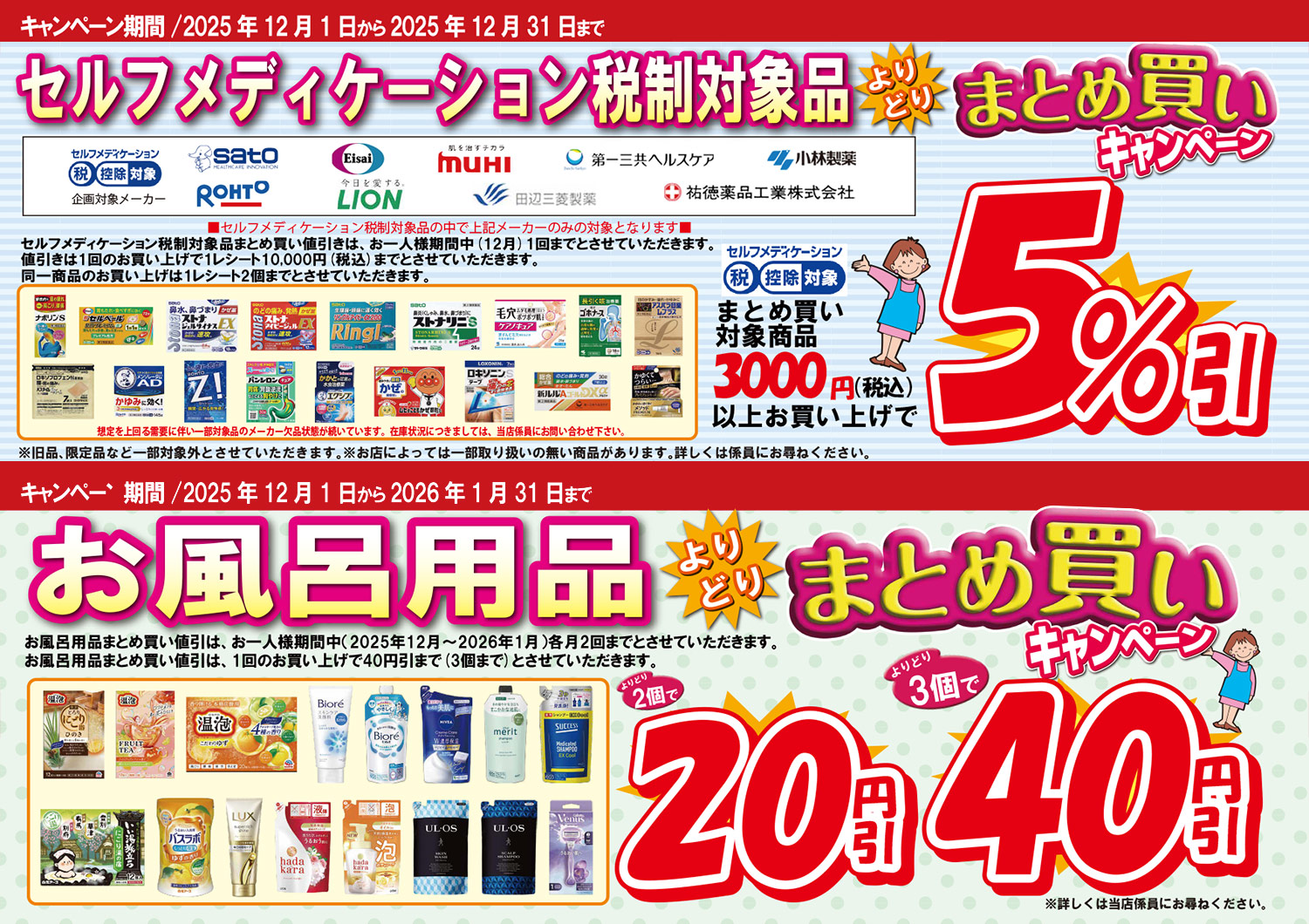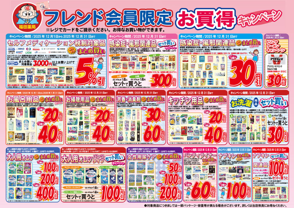 12月のメーカータイアップ企画です! Posted on 2025年12月21日 fukuyakuPosted in 店舗からのお知らせ フレンド会員限定企画!今月のメーカータイアップ企画も盛り沢山です。 レジでフレンド会員をご提示ください。お得なお買い物ができます。 ぜひ、福田薬局の店頭でお確かめください!